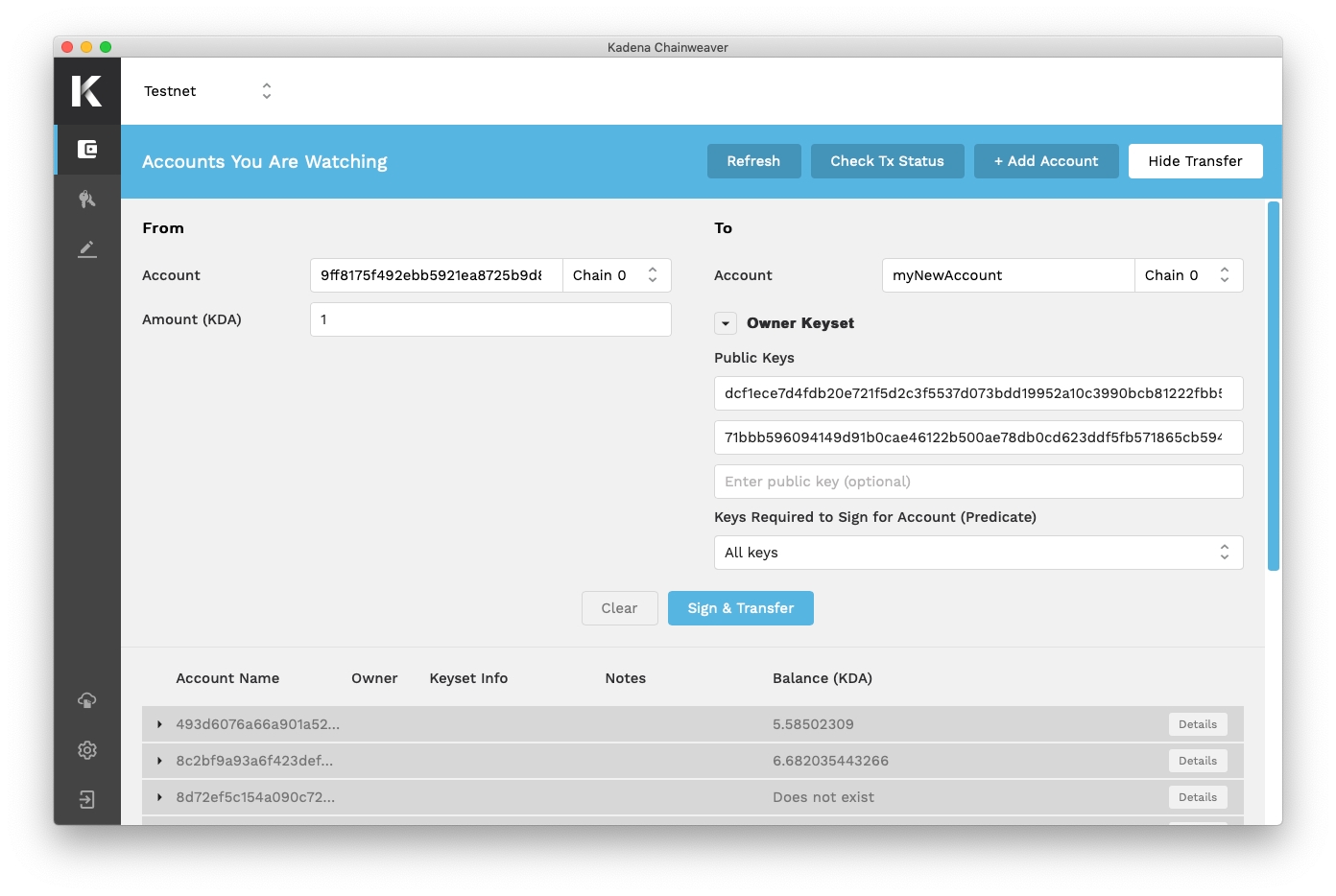 In addition to signing transactions from accounts which are owned within the wallet, Chainweaver also provides an interface to sign transactions from accounts which are not owned within the wallet. Chainweaver does this by auto-detecting whether the sending account is owned by the wallet. If the sending account is not owned by the wallet, Chainweaver will present a field for the user to enter the required private key(s). This special feature makes it easier for users to transfer KDA into Chainweaver from external wallets and exchanges.