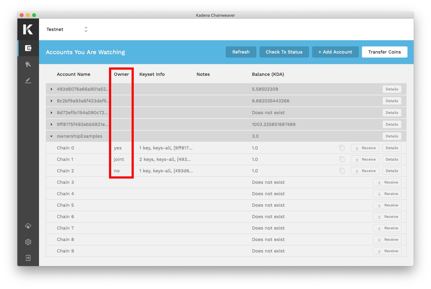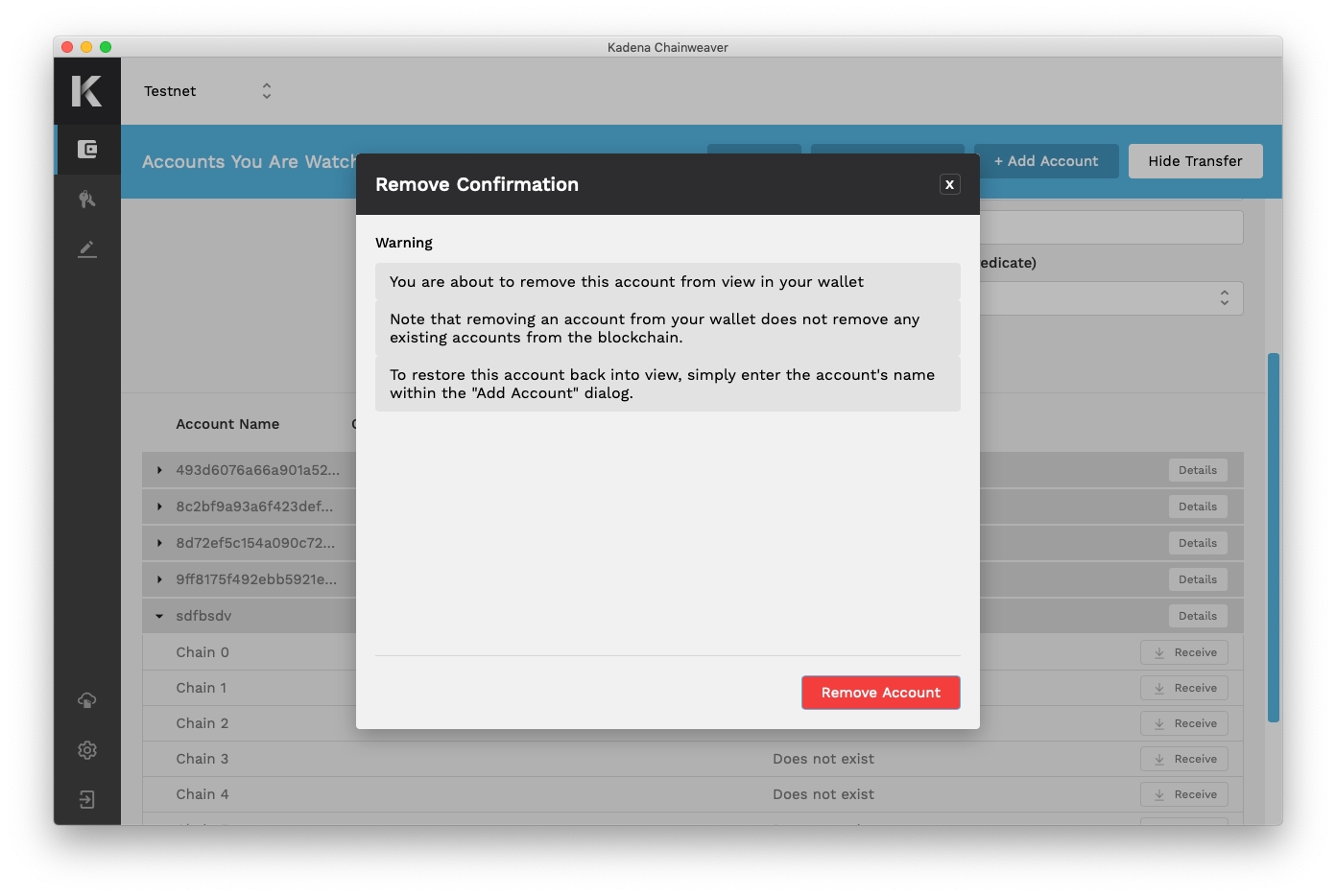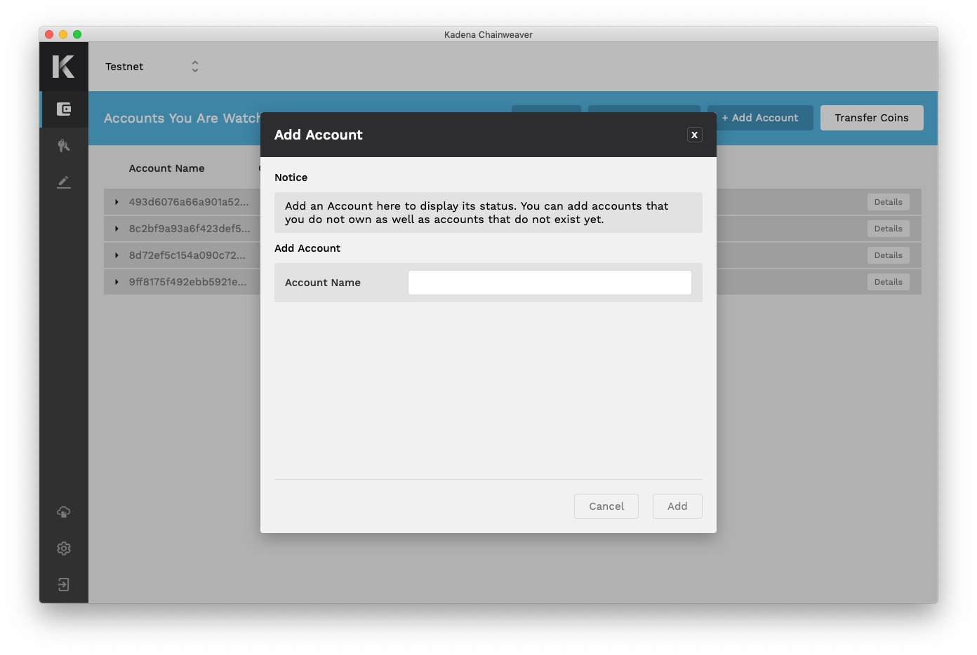 Accounts are effectively equivalent to your identity on the blockchain. When you add an Account in Chainweaver, you will be able to view information about it such as its keyset info and balance on each of the known chains.