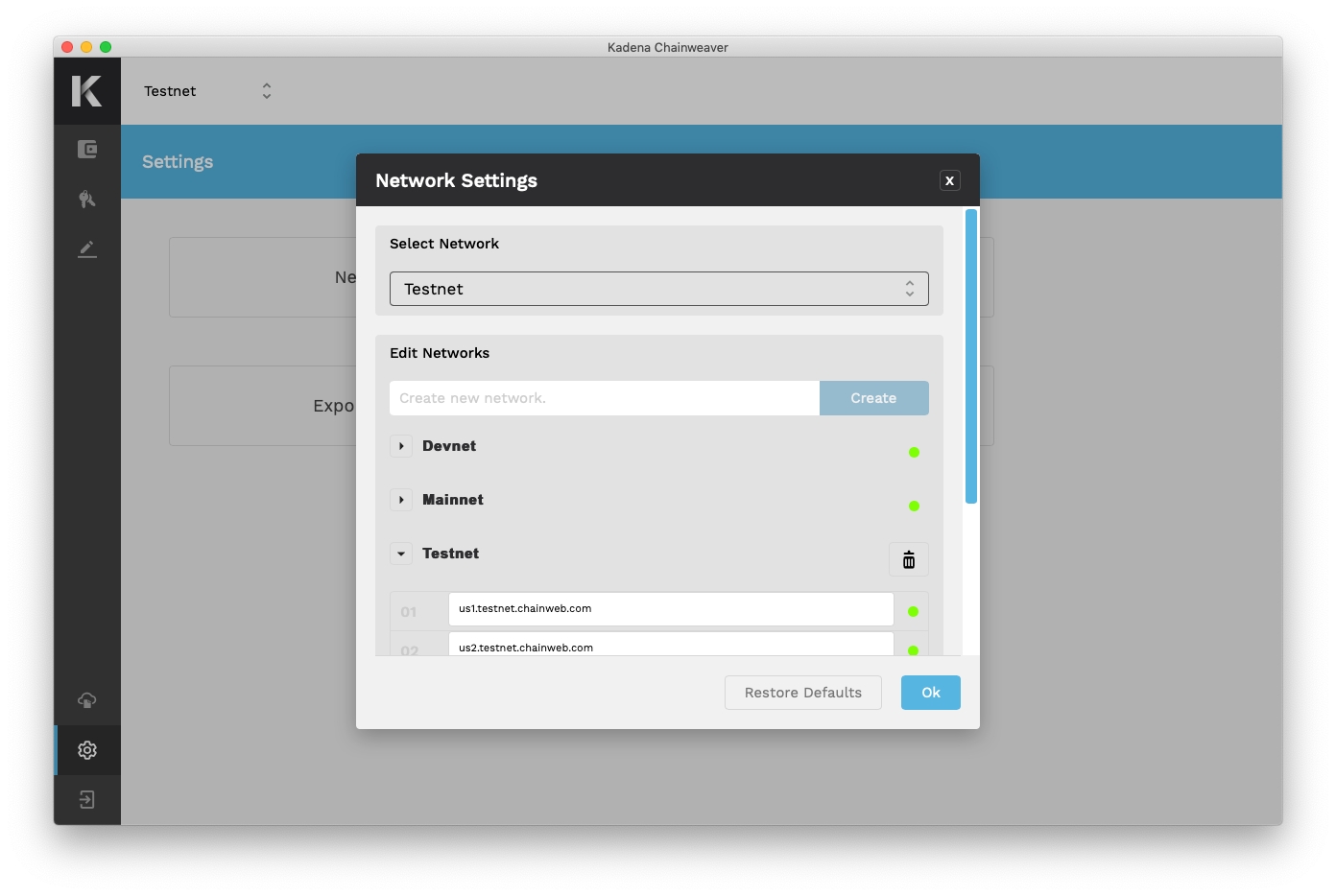 Chainweaver allows you to interact with different networks, including the main network (“Mainnet”) and a test network (“Testnet”)