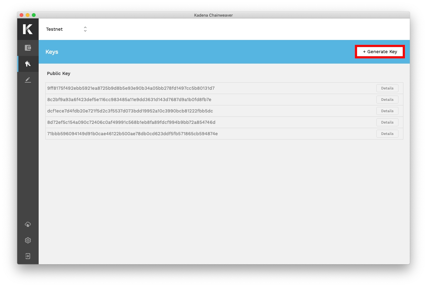 The first step towards transacting on the Kadena blockchain is to generate a key pair. Chainweaver automatically generates your first key.