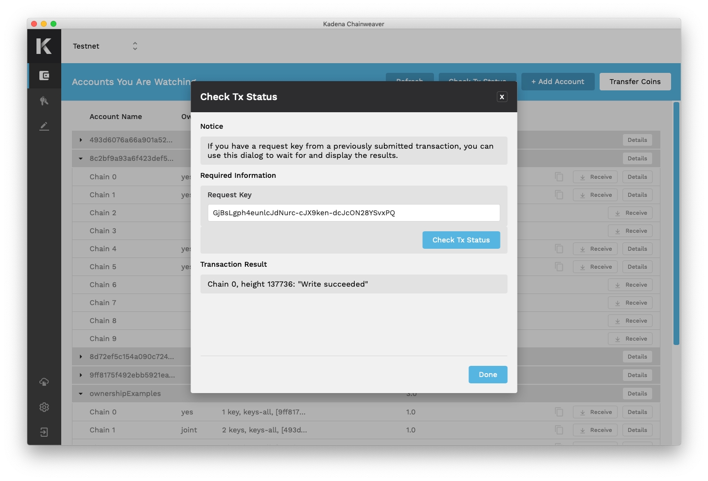 If you have a request key from a previously submitted transaction, you can also display its result by selecting the “Check Tx Status” button.