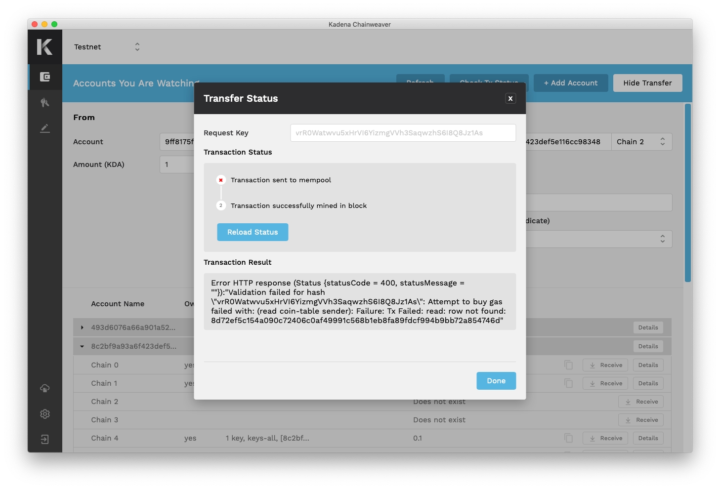 Once a transaction has been submitted, Chainweaver will display the Transfer Status as it moves through progress states. The average block time in the Kadena network is 30 seconds. So depending on the Transaction Speed you assigned, it may take several blocks before your transaction is successfully mined.
