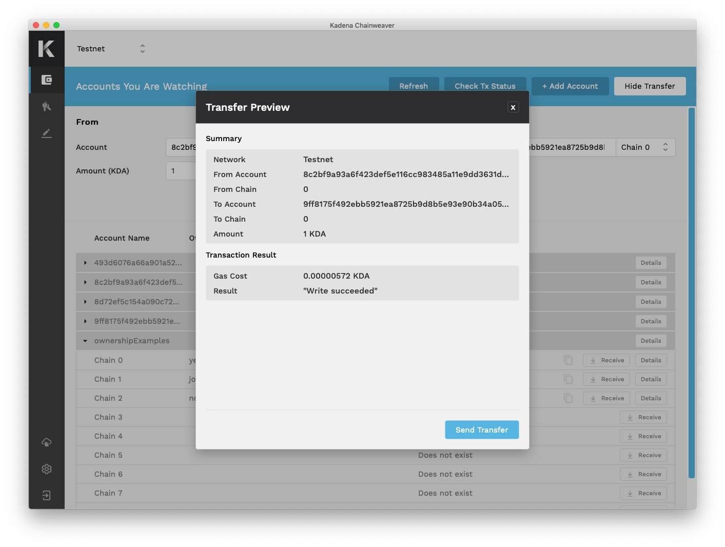 Since the Kadena public blockchain network braids multiple chains together, you can transfer KDA within a single chain or across two different chains.