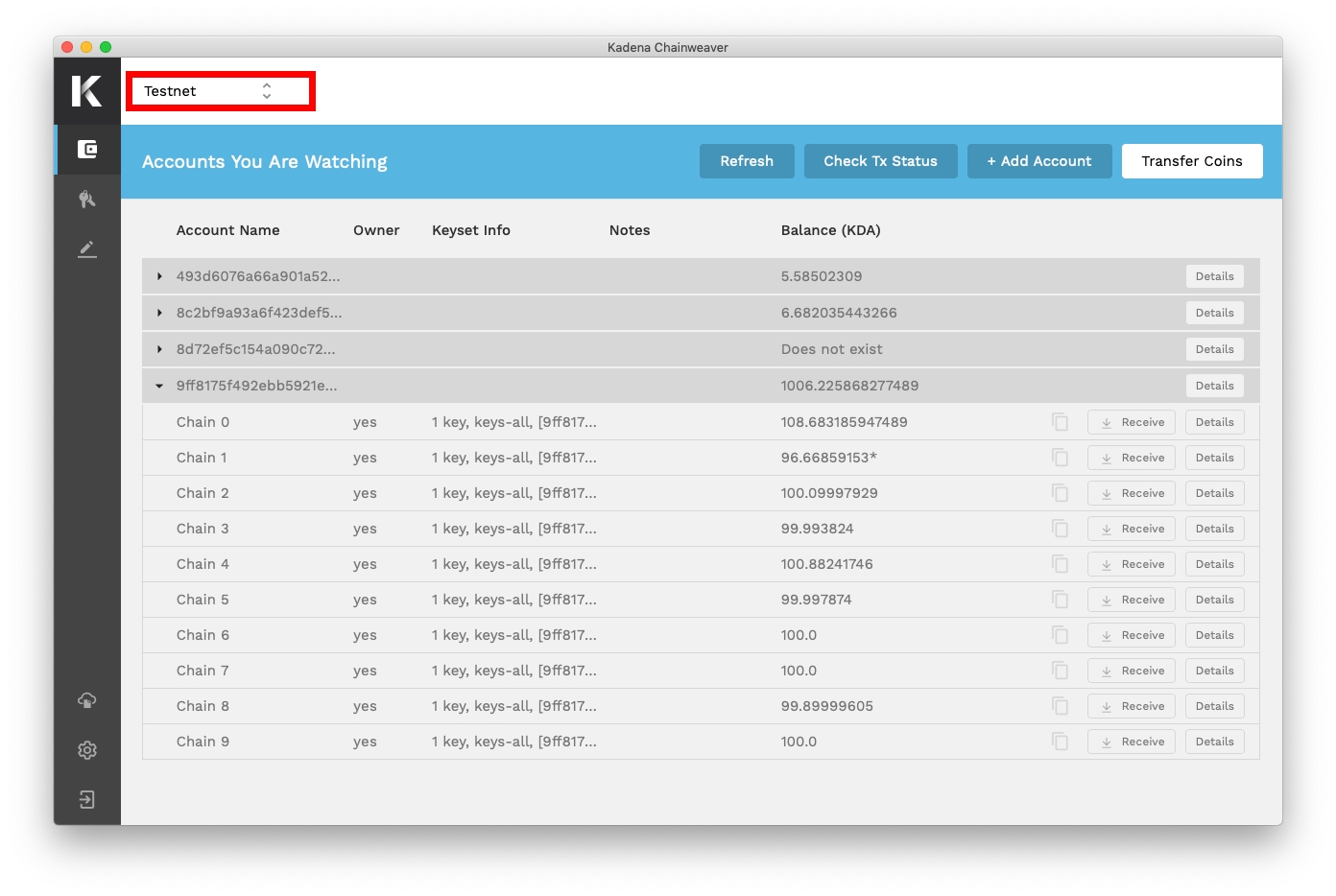 Chainweaver allows you to interact with different networks, including the main network (“Mainnet”) and a test network (“Testnet”)