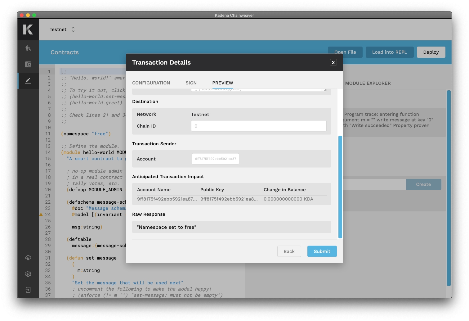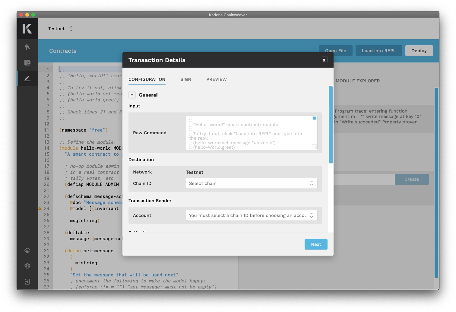 The ability to write, deploy, and call smart contracts from within Chainweaver makes it one of the most comprehensive workbench tools for blockchain. Navigate to the Contracts section and utilize the integrated development environment (IDE) for developing and testing Pact smart contracts.