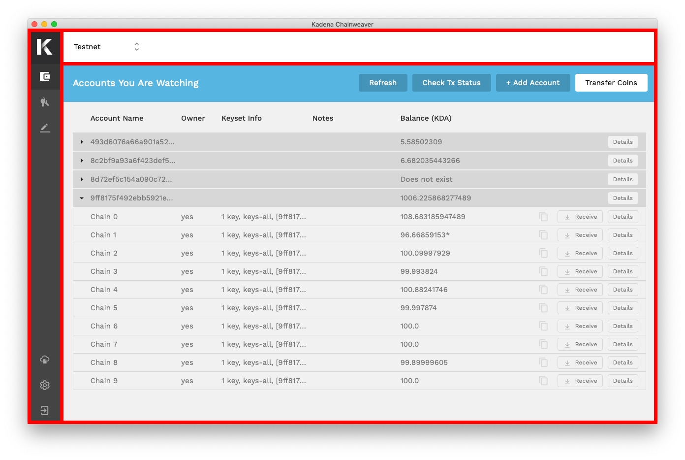 Accounts: Display of all added accounts and their status across chains. Deposit and withdraw KDA.