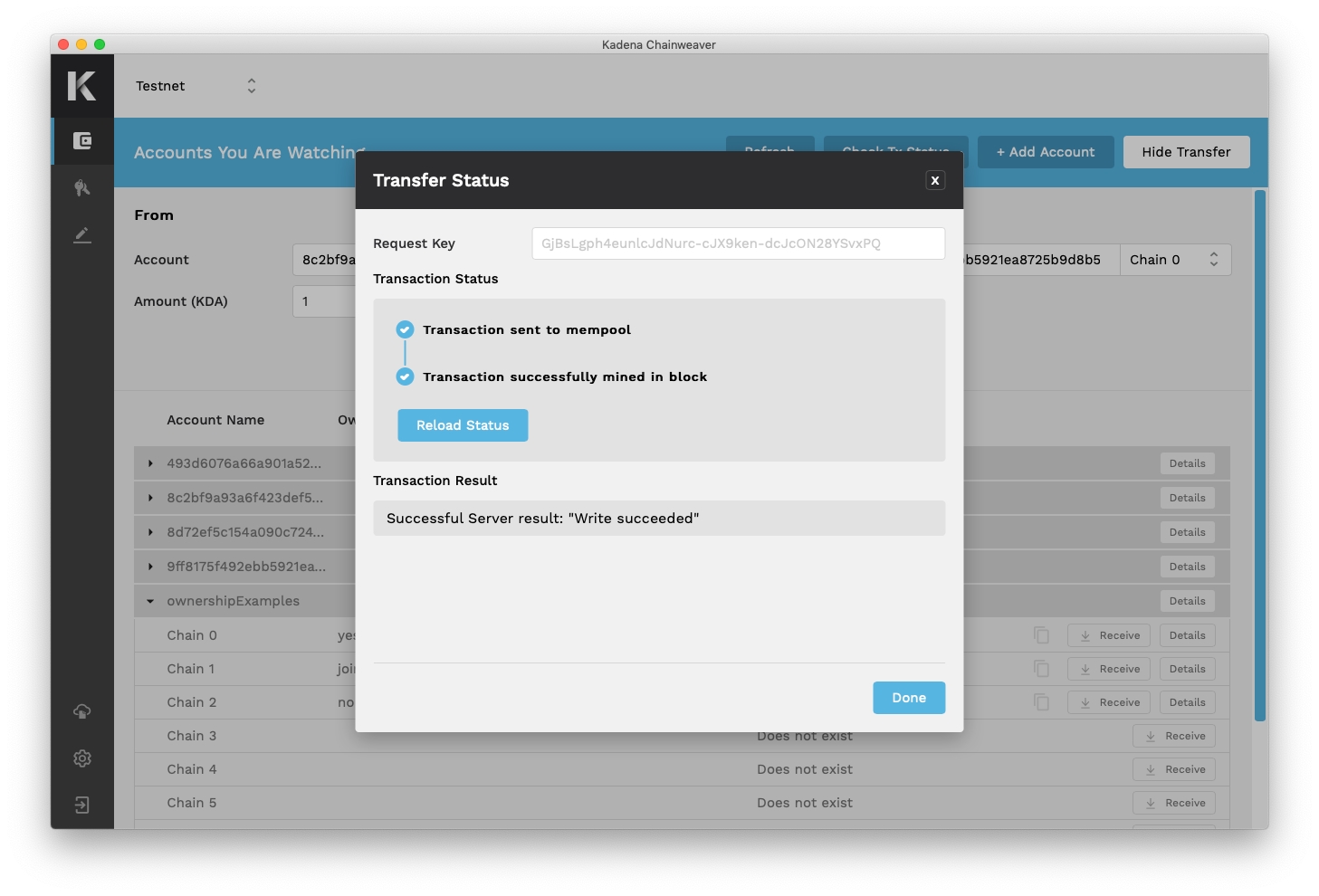 Once a transaction has been submitted, Chainweaver will display the Transfer Status as it moves through progress states. The average block time in the Kadena network is 30 seconds. So depending on the Transaction Speed you assigned, it may take several blocks before your transaction is successfully mined.